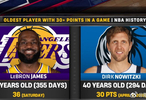 据报道,詹姆斯取代诺维斯基成为历史上拿下30+得分的最年长球员(40岁355天)