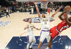 洛杉矶快船队球星科怀·伦纳德在球队战胜湖人队后,被一名记者的闪光灯晃得睁不开眼。