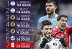 英超拉美球员射手榜:阿圭罗184球第1,希门尼斯63球升至第7