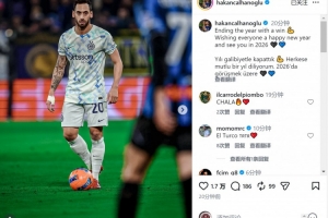 国米中场恰尔汗奥卢社媒晒出比赛照片,并写道:“以一场胜利结束这一年,祝大家新年快乐,2026年见。”