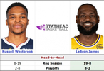 生涯至今,威少常规赛面对詹姆斯为8胜19负,季后赛为2胜8负。