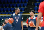杜兰特赛后笑嘻嘻的聊着哈利伯顿: