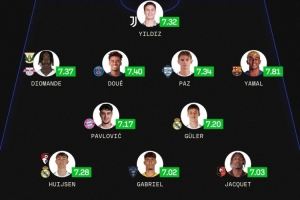 前卫:扬·迪奥曼德(莱加内斯、莱比锡,7.37分)、杜埃(巴黎,7.40分)、帕斯(科莫,7.34分)、亚马尔(巴萨,7.81分)