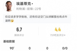 埃基蒂克本场4射1正1失良机+3越位 18对抗6成功 获评6.7分