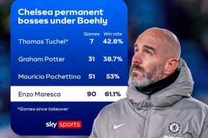 伯利时期蓝军4任主帅胜率:马雷斯卡61.1%,波叔53%,图赫尔42.8%