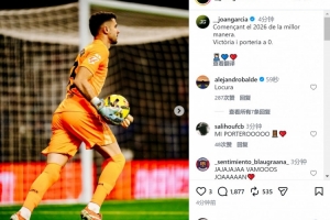 霍安·加西亚社媒晒出比赛照片,庆祝球队取胜,他写道:“以最好的方式开启2026年,胜利+零封。”
