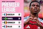 阿森纳英超后卫射手榜:科斯切尔尼22球居首