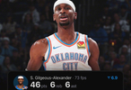 全场比赛,亚历山大出场42分钟,26中14,三分8中1,罚球19中17,砍下46分6篮板6助攻0失误。