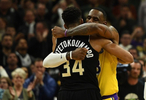 字母哥赛后获詹姆斯球衣并当场穿上