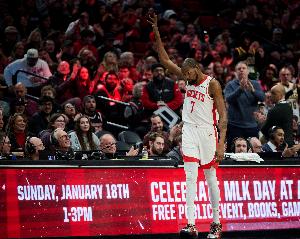 开拓者播音员致敬杜兰特,和杜兰特握手,开拓者现场观众鼓掌致敬,KD单手指天回以致意