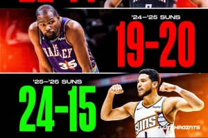 太阳本赛季前39场,战绩24胜15负,暂时排名西部第6。上赛季同期,他们战绩是19胜20负。